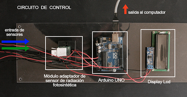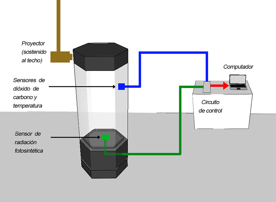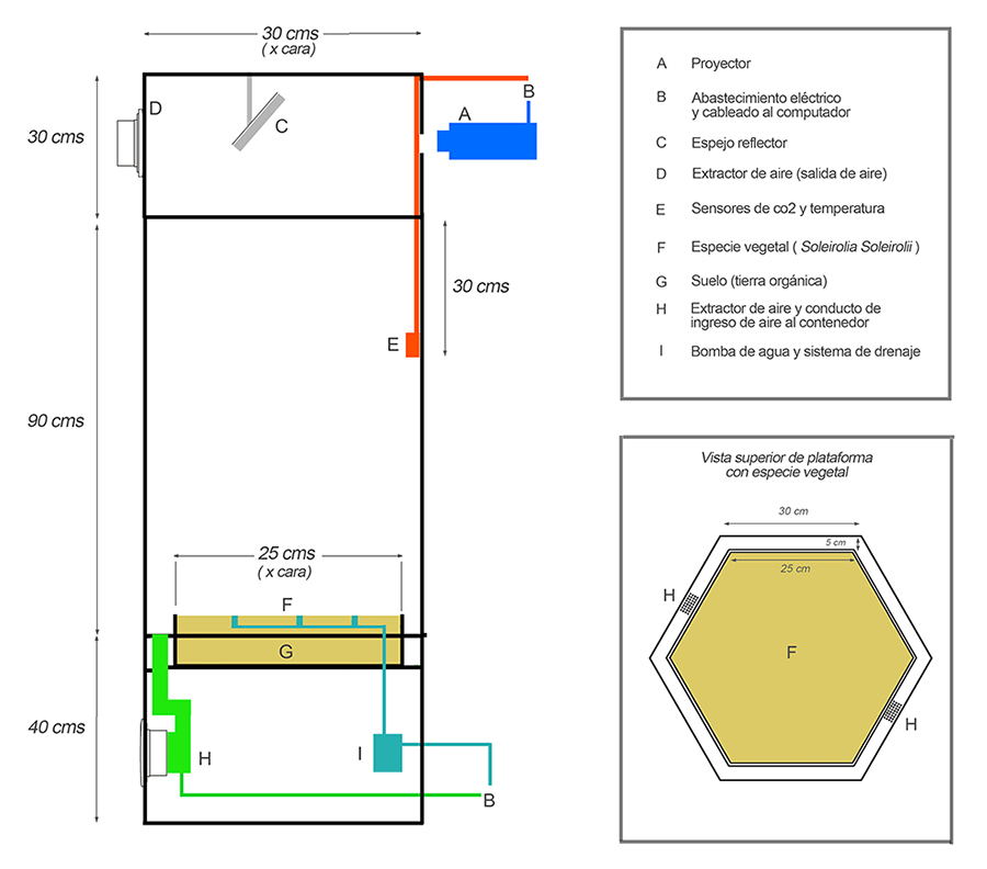 Contenedor El contenedor está formado de acrílico negro y transparente, de grosores 2mm a 4mm. El aire en su interior fluye por medio de 2 extractores ubicados en la parte superior e inferior (en esquema, puntos D y H). En la parte superior, fuera del contenedor, se ubica un proyector (A). La planta es alimentada con agua desde la base del contenedor por medio de una bomba (I). En el área interior-superior del contenedor se ubican sensores de CO2 y temperatura (E). En el centro de la plataforma de la planta, un sensor de radiación fotosintética (F).