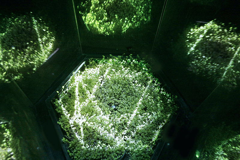 Simbiosis Meditativa es una obra transdisciplinaria que explora un estado de inter-dependencia entre un organismo vivo y un sistema electrónico, buscando un resultado estético de este proceso. Compuesta de un contenedor con sensores especiales en su interior (dióxido de carbono) mas un módulo computarizado, se crean bancos de datos del proceso de fotosíntesis de una planta (Soleirolia Soleirolii), con los cuales se construyen patrones gráficos que luego se proyectan en la superficie de la planta, influyendo nuevamente en su fotosíntesis a través de la intensidad de la luz emitida por la misma imagen. Se crea así un ciclo constante, retroalimentado y mutuo entre fotosíntesis y proyección digital, mientras que la planta crece en el tiempo y la imagen evoluciona en función de la información emitida por la planta.