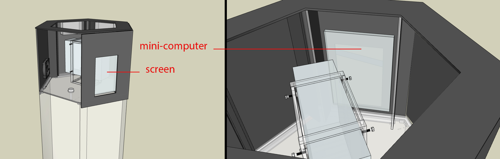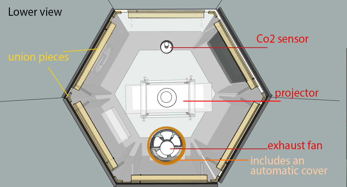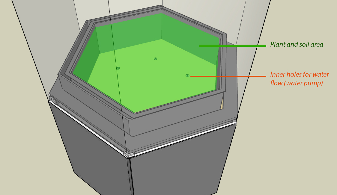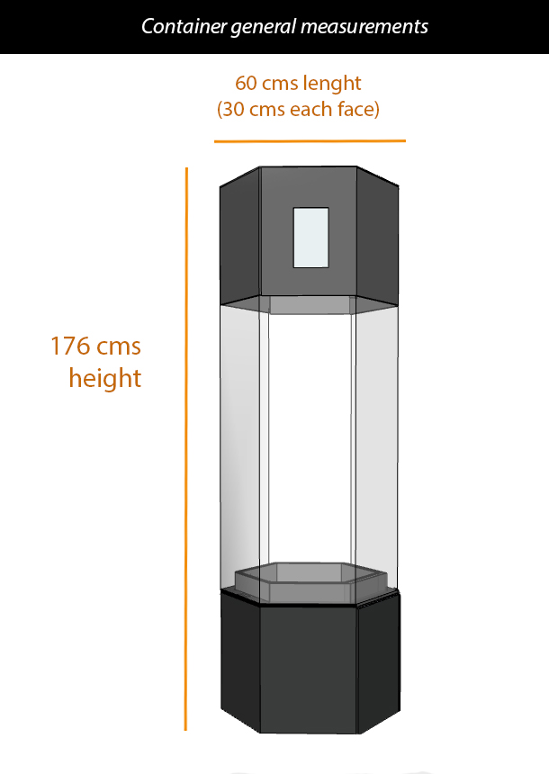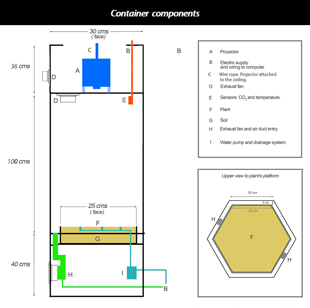 Container The container is composed of acrylic glass (black and transparent), 3mm and 4mm thick. The air flows inside the container by 2 fans (in the scheme, points D and H) and automatic doors. At the top, outside the container, a proyector is located (A). The plant is feeding with water in the container's base, throught a water pump (I). Inside the container, CO2 and temperature sensors are located (E). In the center of the plant's platform, a photosynthetic radiation sensor (F).
