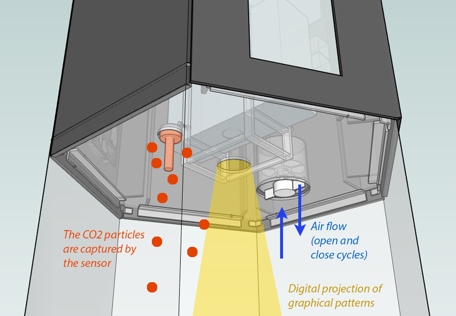 MEDITATIVE SYMBIOSIS COMPONENTS The installation is composed of a container with a plant and an electronic system with sensors and circuitry connected to a computer. In the installation every single component is part of the concept.