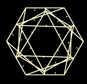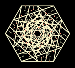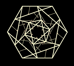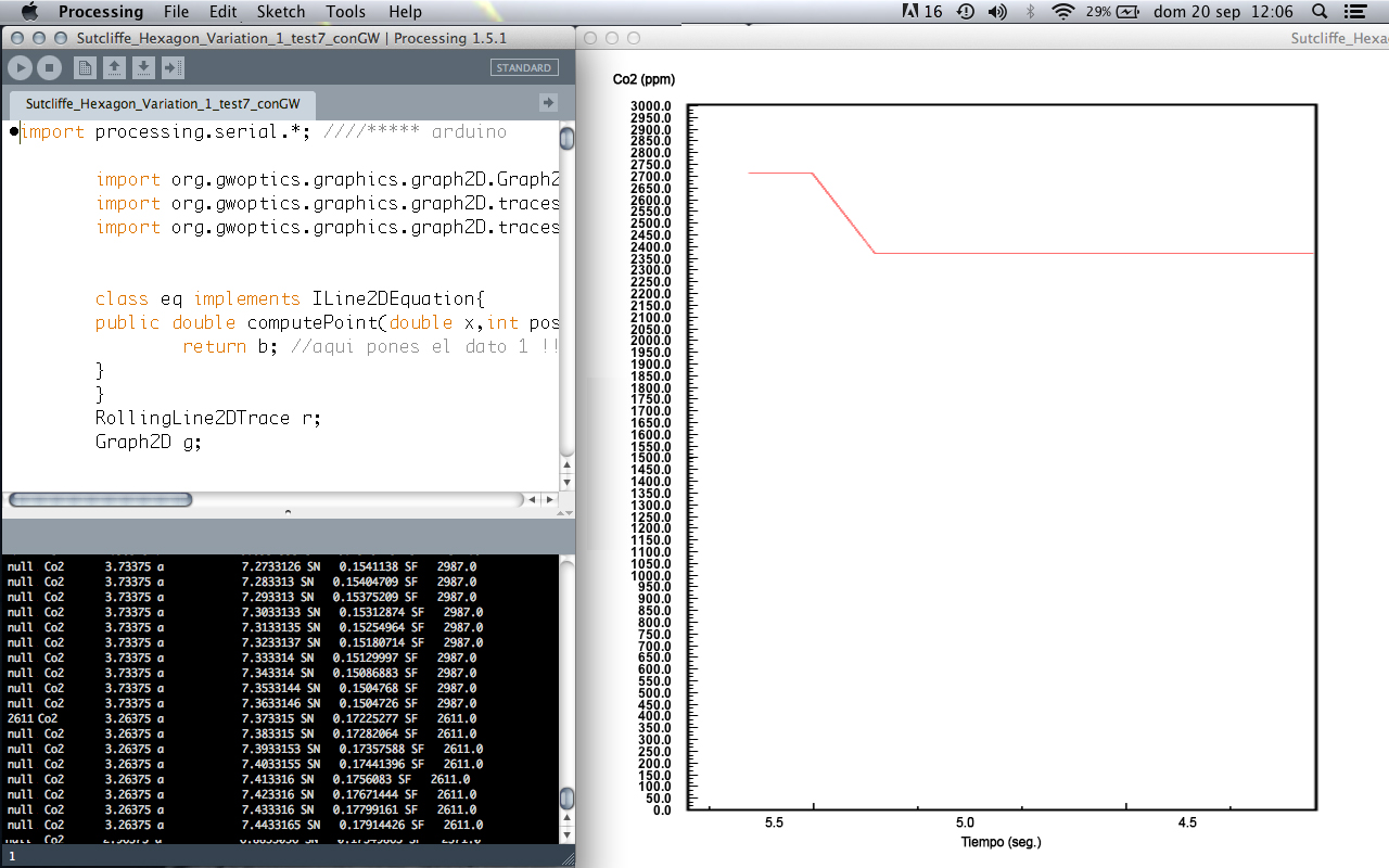 MEDITATIVE SYMBIOSIS COMPUTING STRUCTURE For the graphic patterns generation, I use the software Processing©. In the code of the graphic patterns is applyed the data obtained from the sensors (CO2 and quantum light). This creates variations in the numeric values of the code, that conform the shape of the digital pattern. Each 10 seconds, the data from sensors is refreshed and the figure regenerates. In parallel, the computer screen shows a a real-time graphic with the CO2 variations(see image below). The graphic patterns have a design based on a fractal geometric structure. Therefore, the data obtained from the sensors change the ramification rate of the figure. This is key to understand the aesthetic of the proyect; It explains the container's hexagonal design and the mathematical structure of the computer code. The code used to generate this graphic pattern is based on a fractal pentagon created by Matt Pearson, and is called Sutcliffe Pentagon; inspired in the researches of the mathematician and artist Allan Sutcliffe. The next images show three examples of the relation between the CO2 values and the fractalization of graphic patterns.