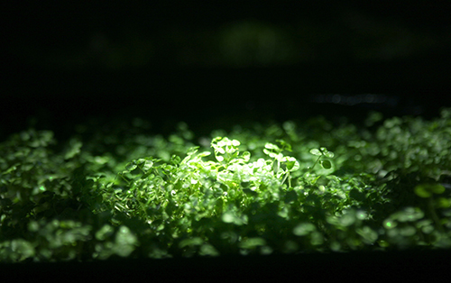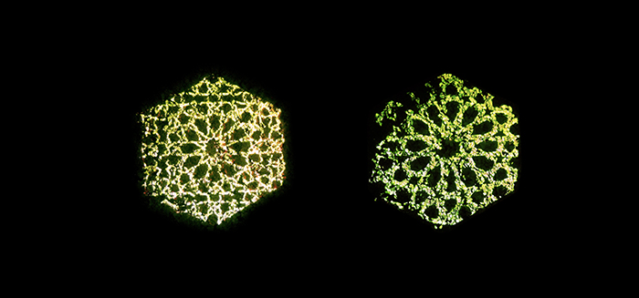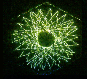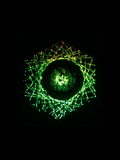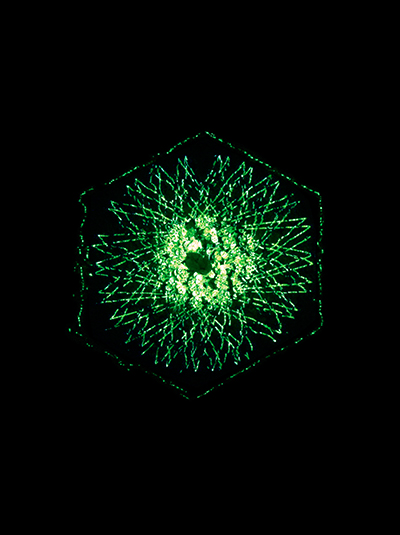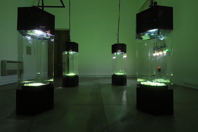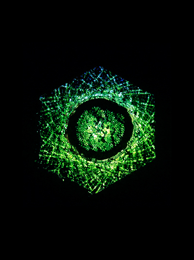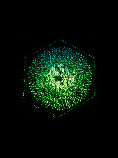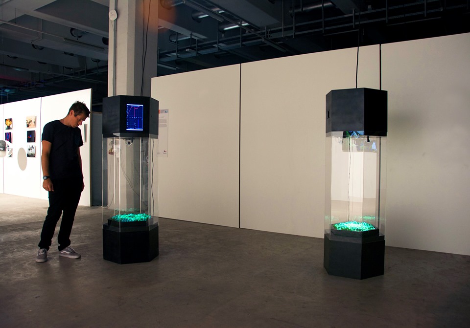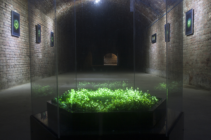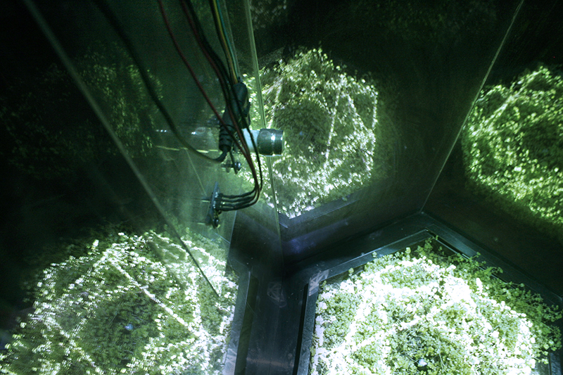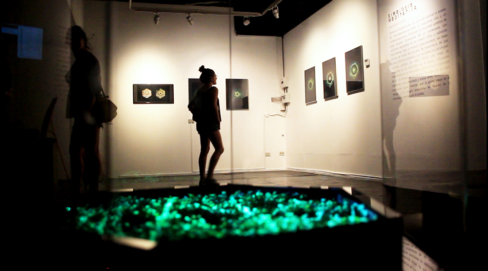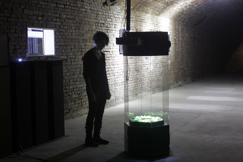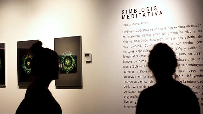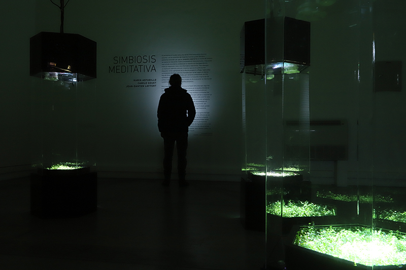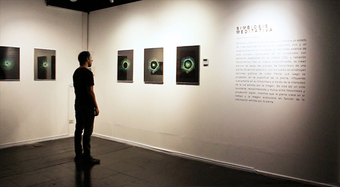 Meditative Symbiosis is a transdisciplinary project that explores a state of interdependence between a living organism and an electronic system, looking for an aesthetic result of this digital-biological process. In special containers, a plant's photosyntesis process is readed by carbon dioxide sensors, creating real-time data which is processed by computers. From this data, generative graphic patterns are created, which then "returns" to the plant being projected over its surface, and influencing again its photosynthesis by the intensity of light and the graphic patterns variation. All this process creates a constant cycle of data while the plant grows and the digital pattern evolves in a mutual dependence.