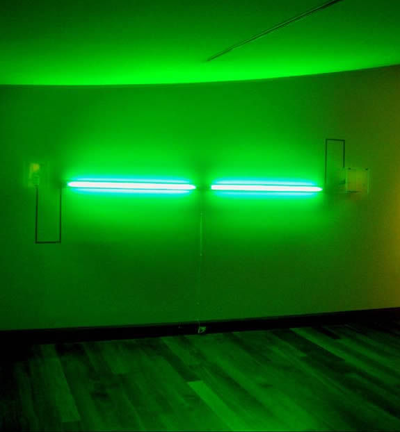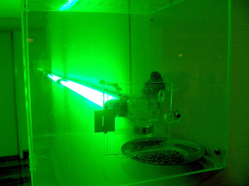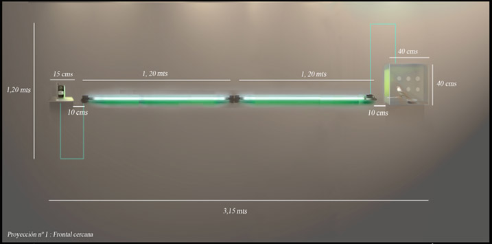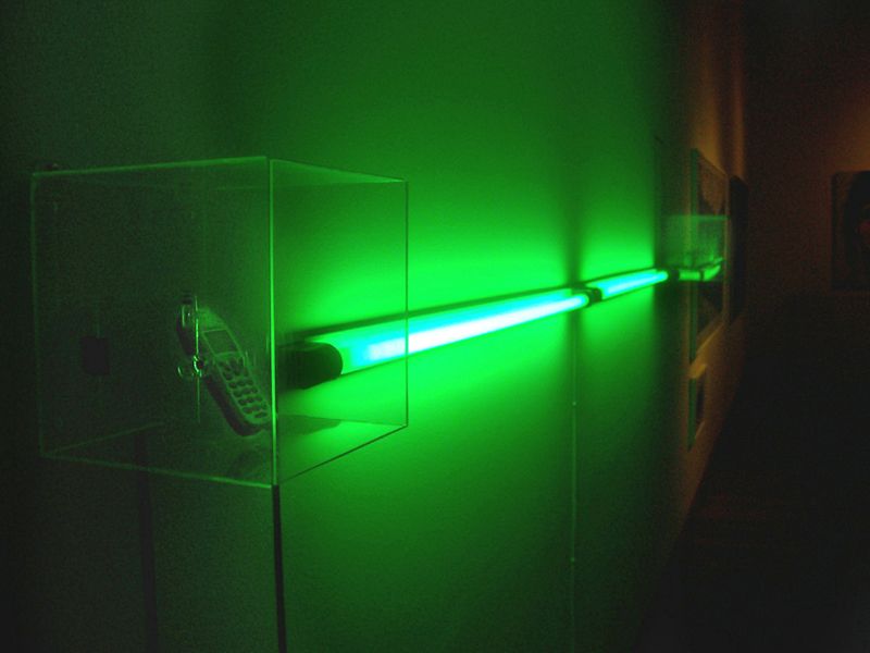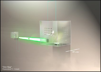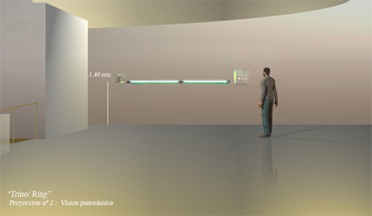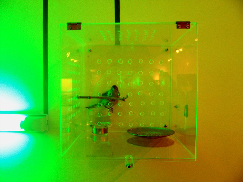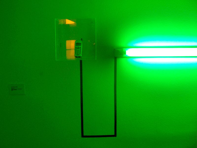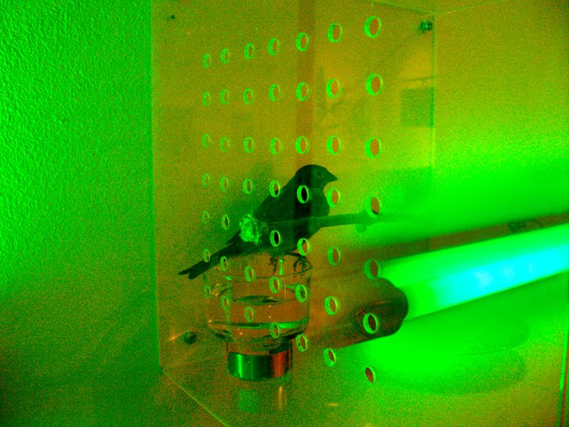 This art-sound installation proposes an allegory of our current urban life and society, more and more synthetic. “Trill/ Ring “ is a sound and visual confrontation between a bird and a mobile phone. Sometimes the bird trills, sometimes the phone rings. The green neon lights creates a visual link between these two elements. The typical urban birds from a capital city as Santiago (in this case a goldfinch), could remember the past background sound of the XVII century’s cities. Now they are replaced by the tipical mobile phone's "ring tone". So this installation proposes a aesthetical link between the urban past and the present one. These images belongs to an exhibition in the Visual Arts Museum of Santiago, Chile (MAVI), in 2007.
